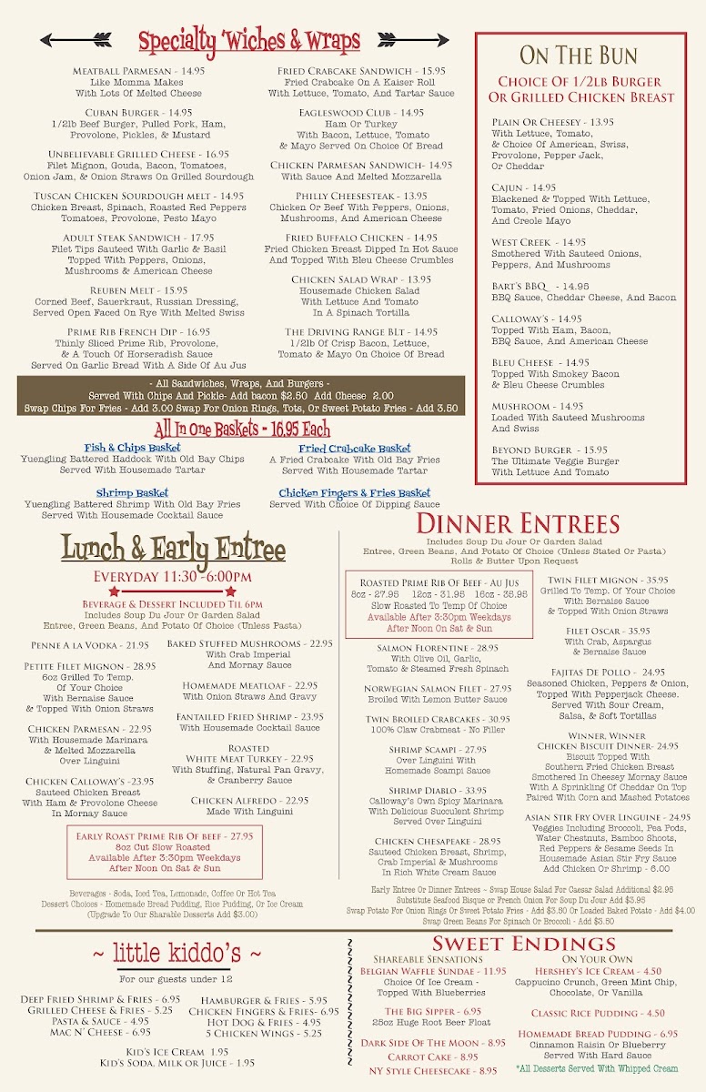 The menu at Calloway's Restaurant & Bar offers a diverse selection of food and beverages suitable for various dining occasions including breakfast, lunch, dinner, and casual gatherings. It features a range of bar and grill items as well as family-friendly options, making it convenient for both quick meals and relaxed dining experiences.